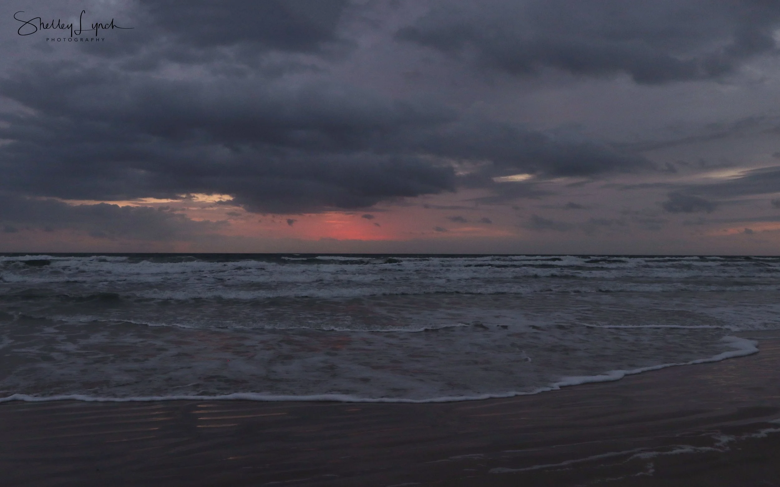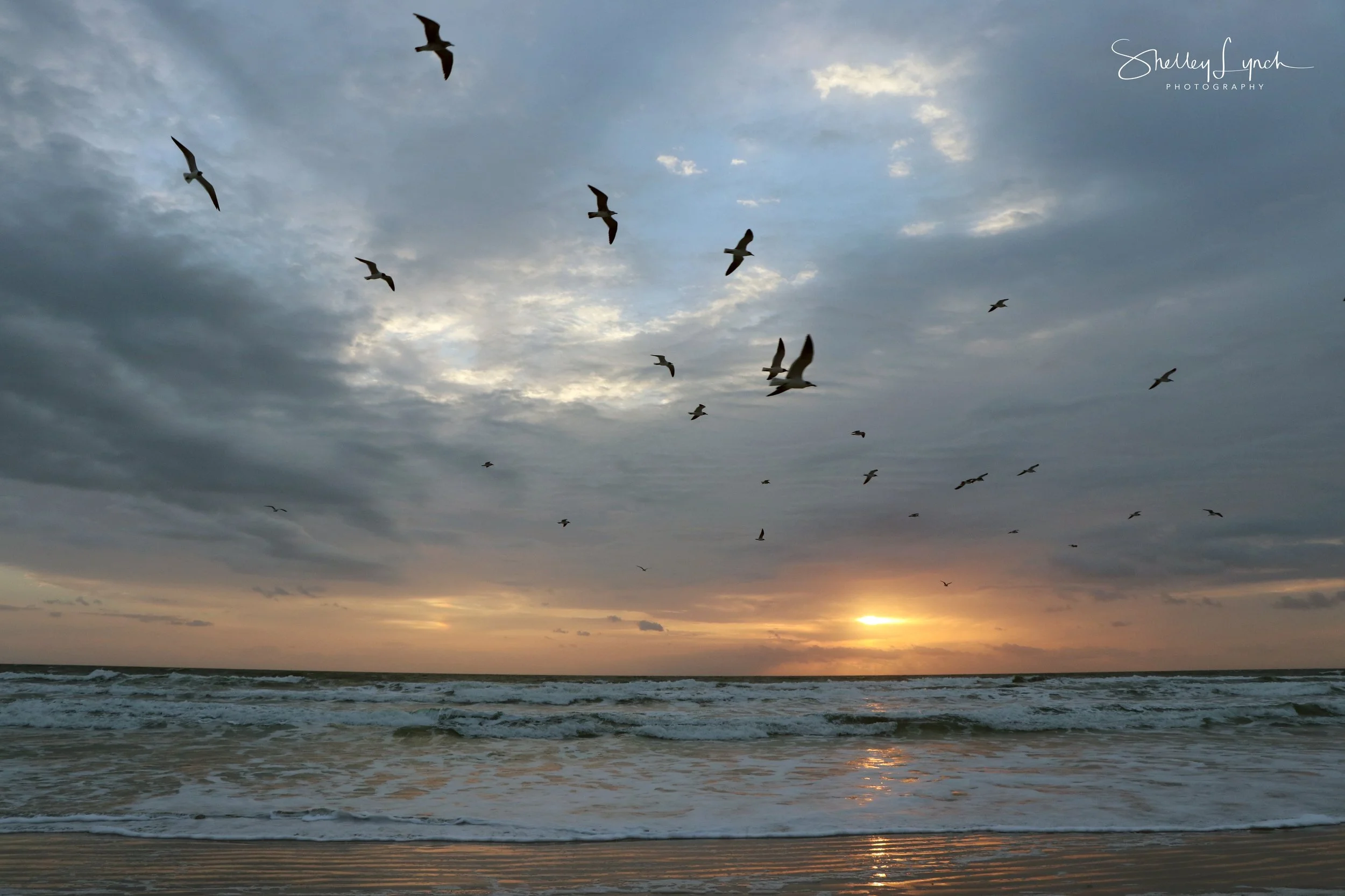 The chilly wind was whipping this morning giving us an invigorating sunrise. Dark grey storm clouds loomed all around adding to the dramatic scene. The flock of seagulls flew in chatty bringing a joyful vibe with them.