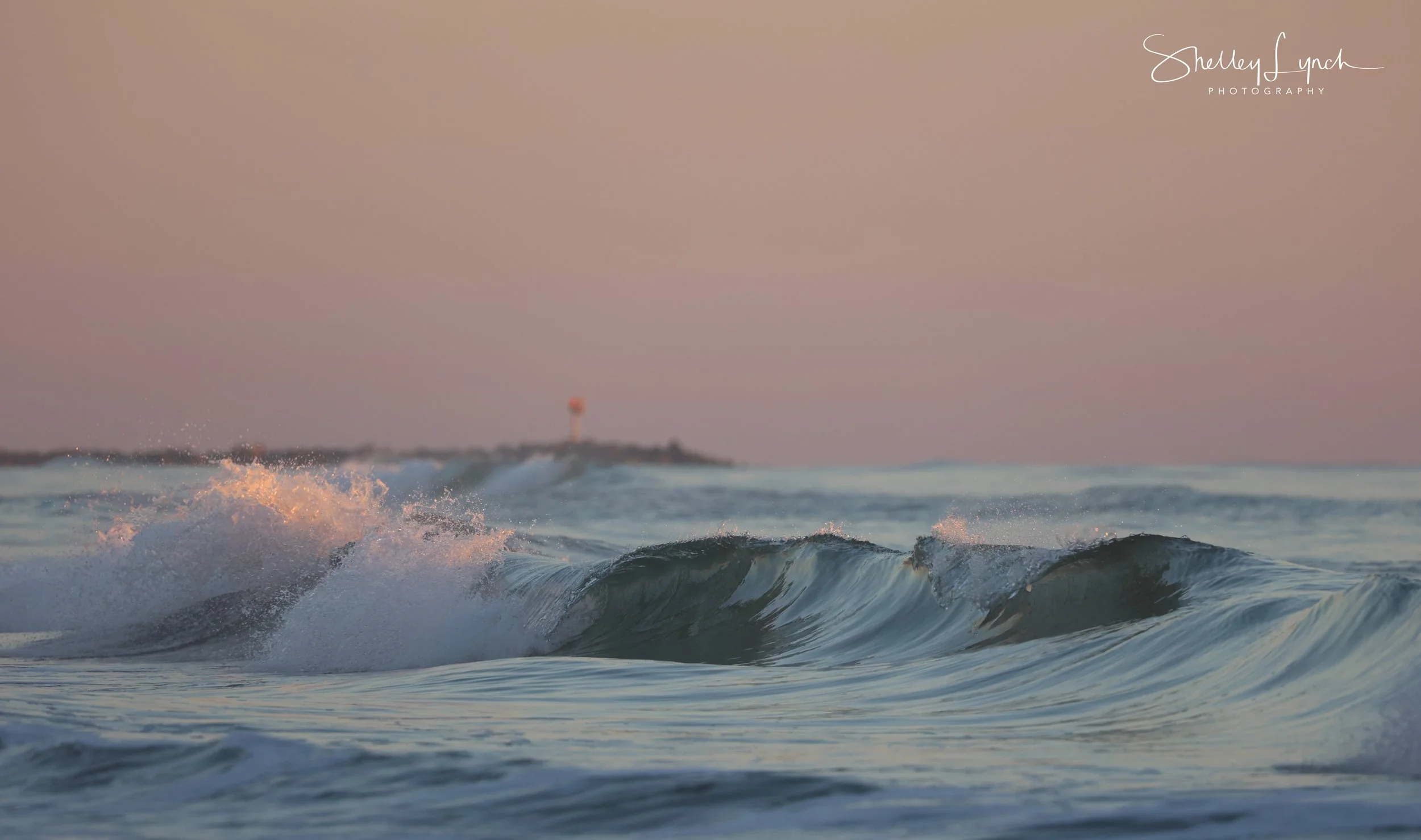 Ahhhh, it was sweet and gorgeous sunrise with pink, emerald green and copper colors as the main attraction. The ocean was calm with medium size waves rolling in catching the light, illuminating their textures.