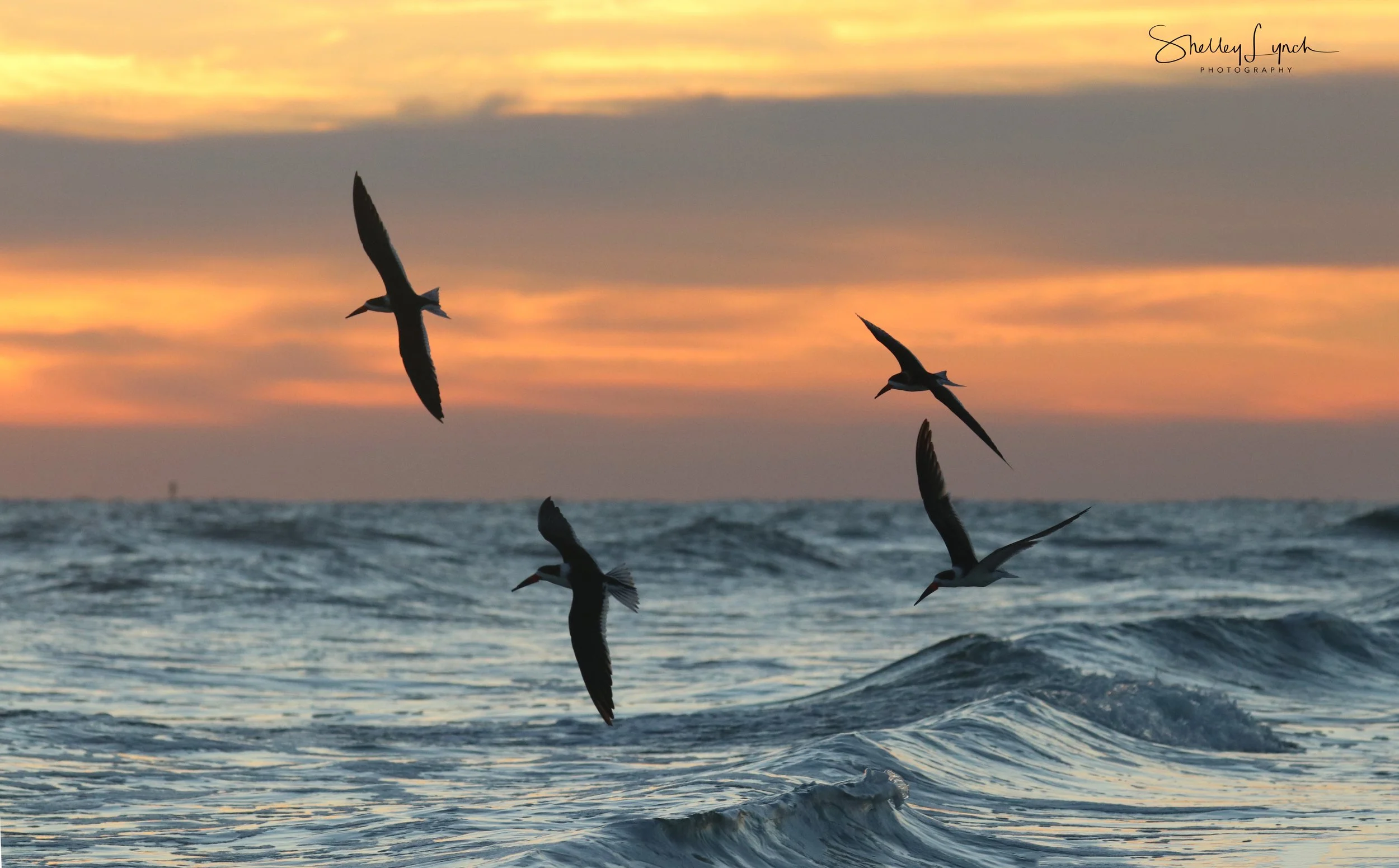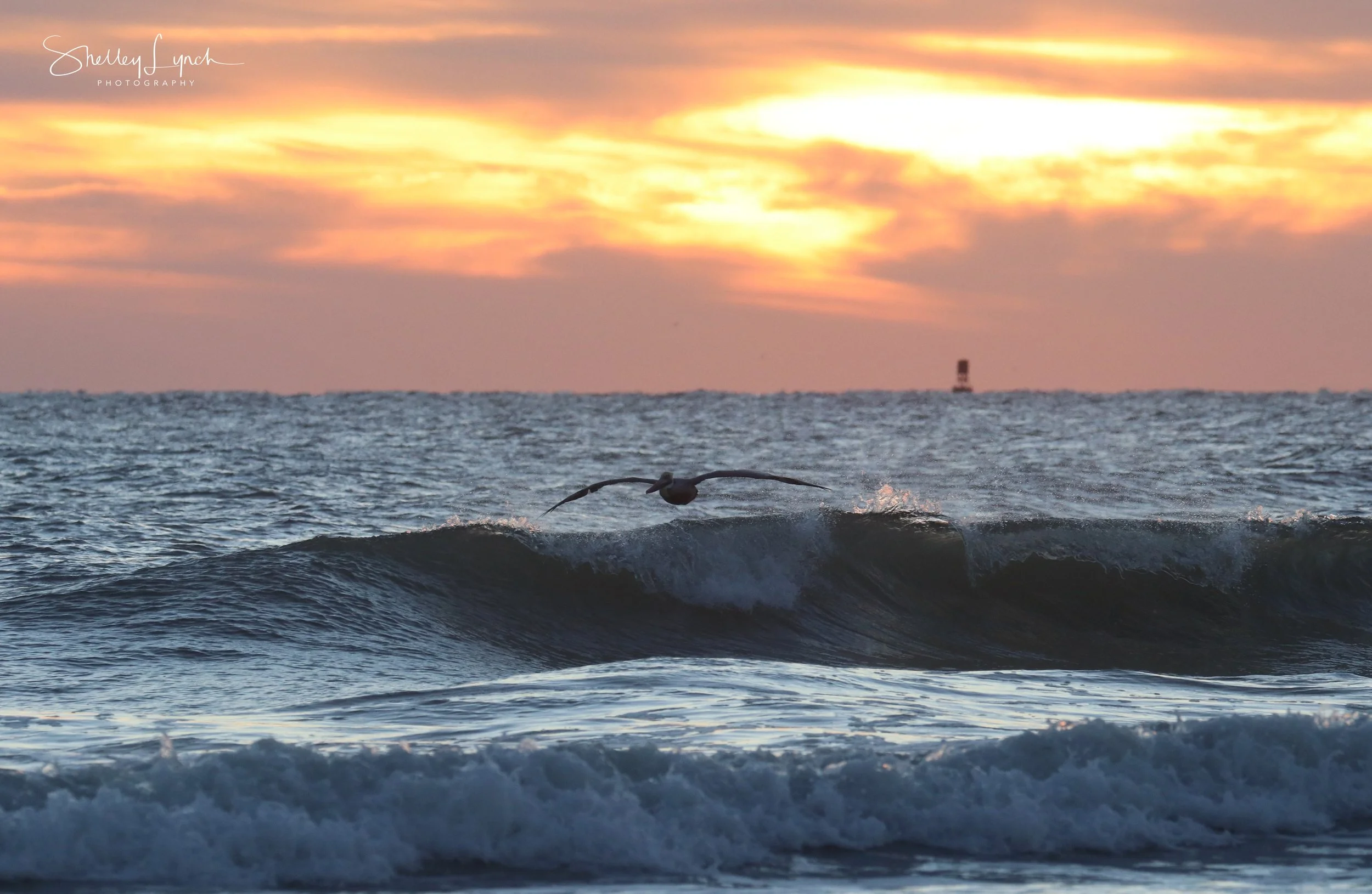 The flow of gulls, sand pipers and skimmers flew in to enjoy hanging out. The textured waves rolling in were catching the sweet pink and golden light. Pelican highway traffic was very light today. Skimmers were thick on the highway flying both directions looking for breakfast.