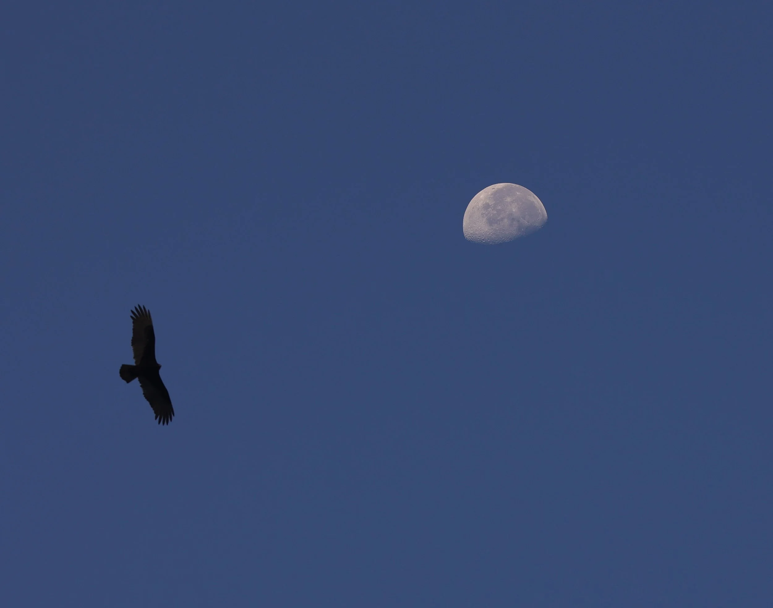 The moon was high and bright in the sky surrounded by vultures enjoying a ride in the thermals. The vulture and moon bring us a combo message.