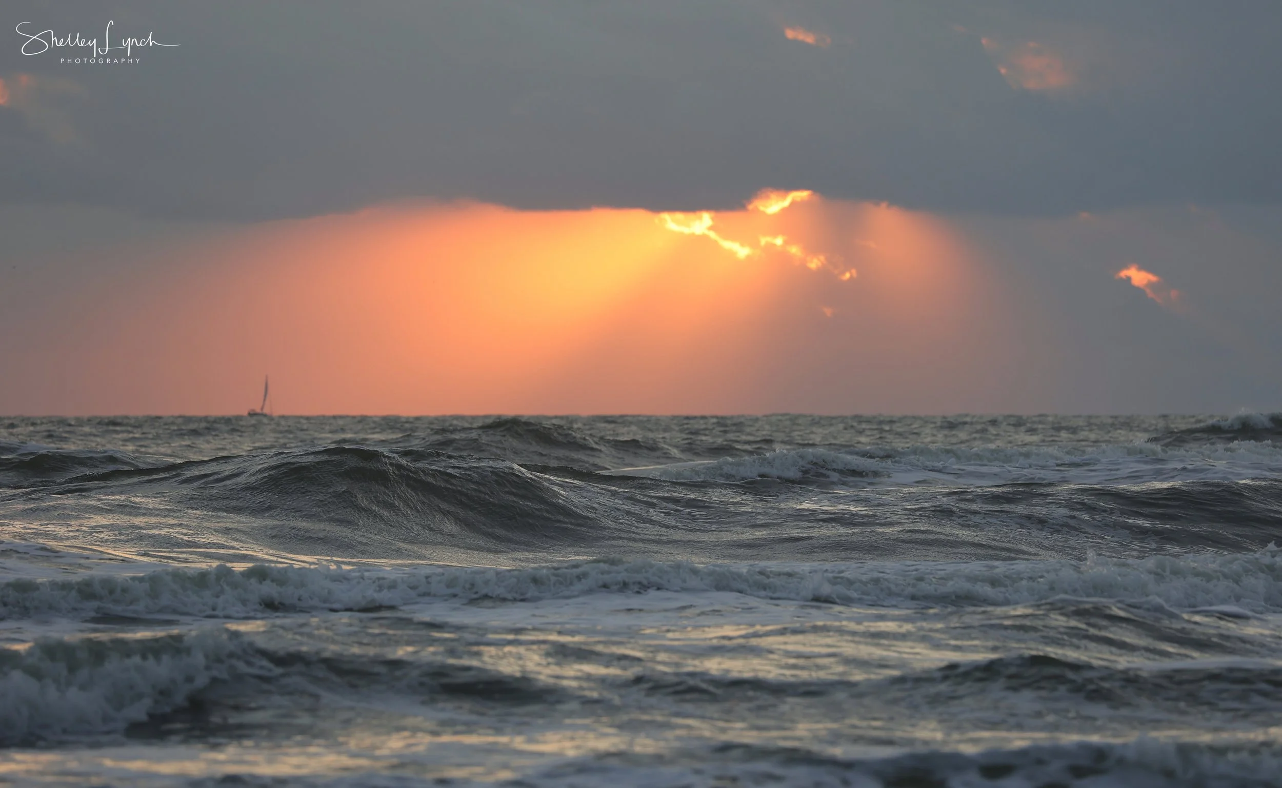 The sun looked like a burning coal as it came up behind the wall of clouds on the horizon. The salty breeze and roaring ocean adding to the energizing vibe. Splashing waves and the sun came sun came together to make beautiful art.