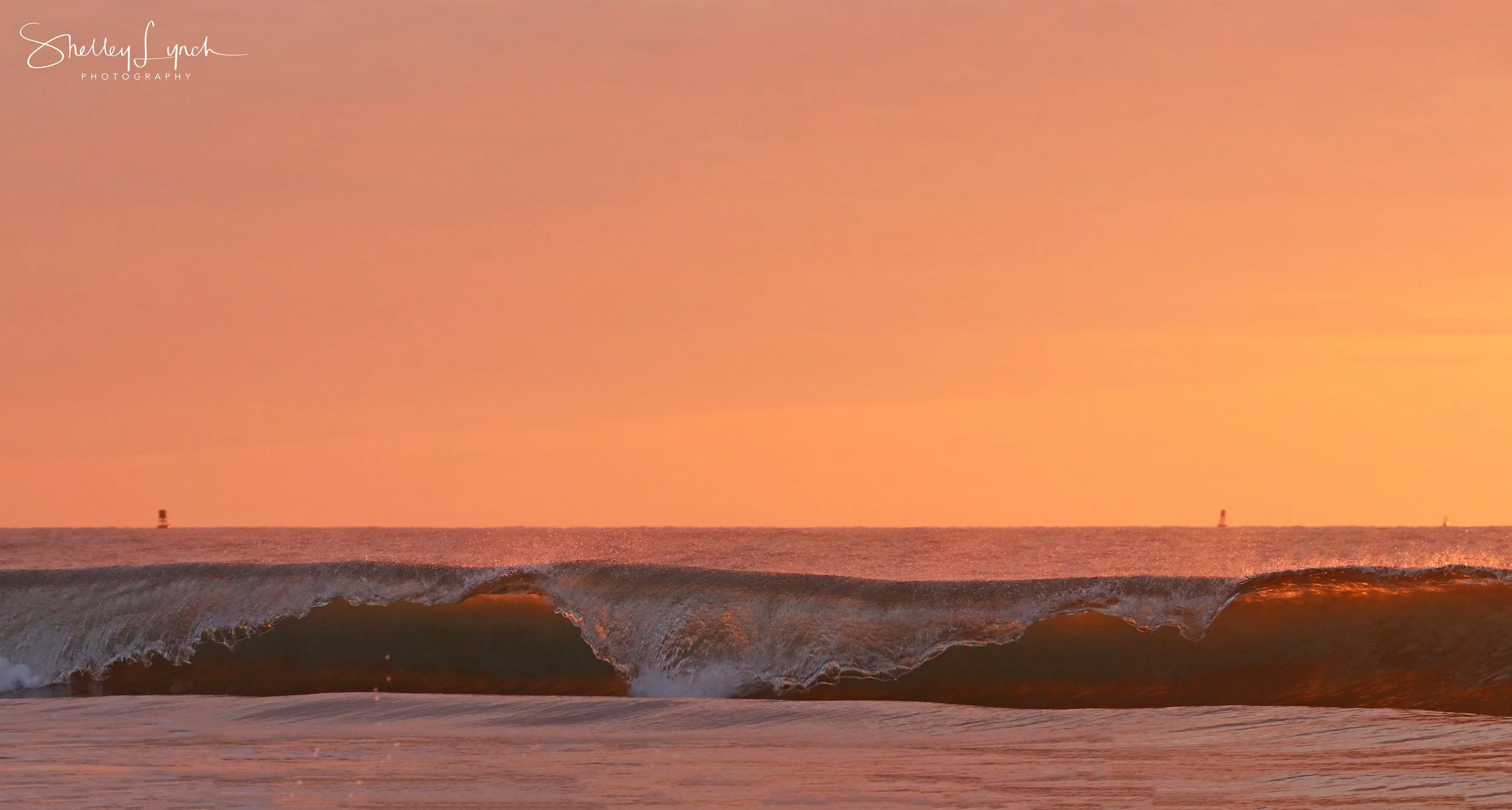 Perfect waves rolled toward shore absorbing the golden and pink light as light Pelican Highway traffic floated above the curl.