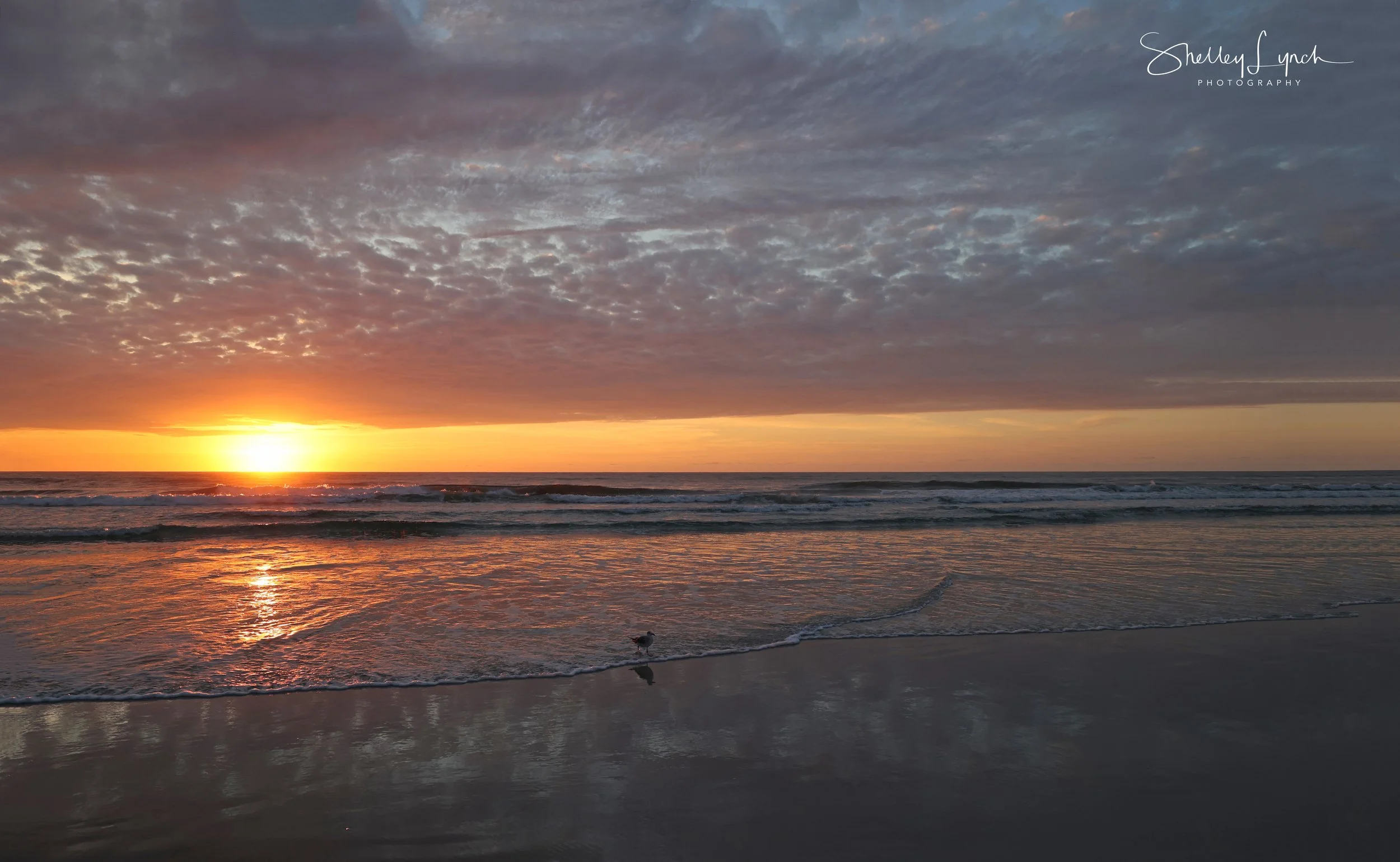 Thanks to a ceiling of fluffy clouds the color show was exquisite this morning. The clouds soaked up all the colors while reflecting off the wet sand giving an expansive feeling.