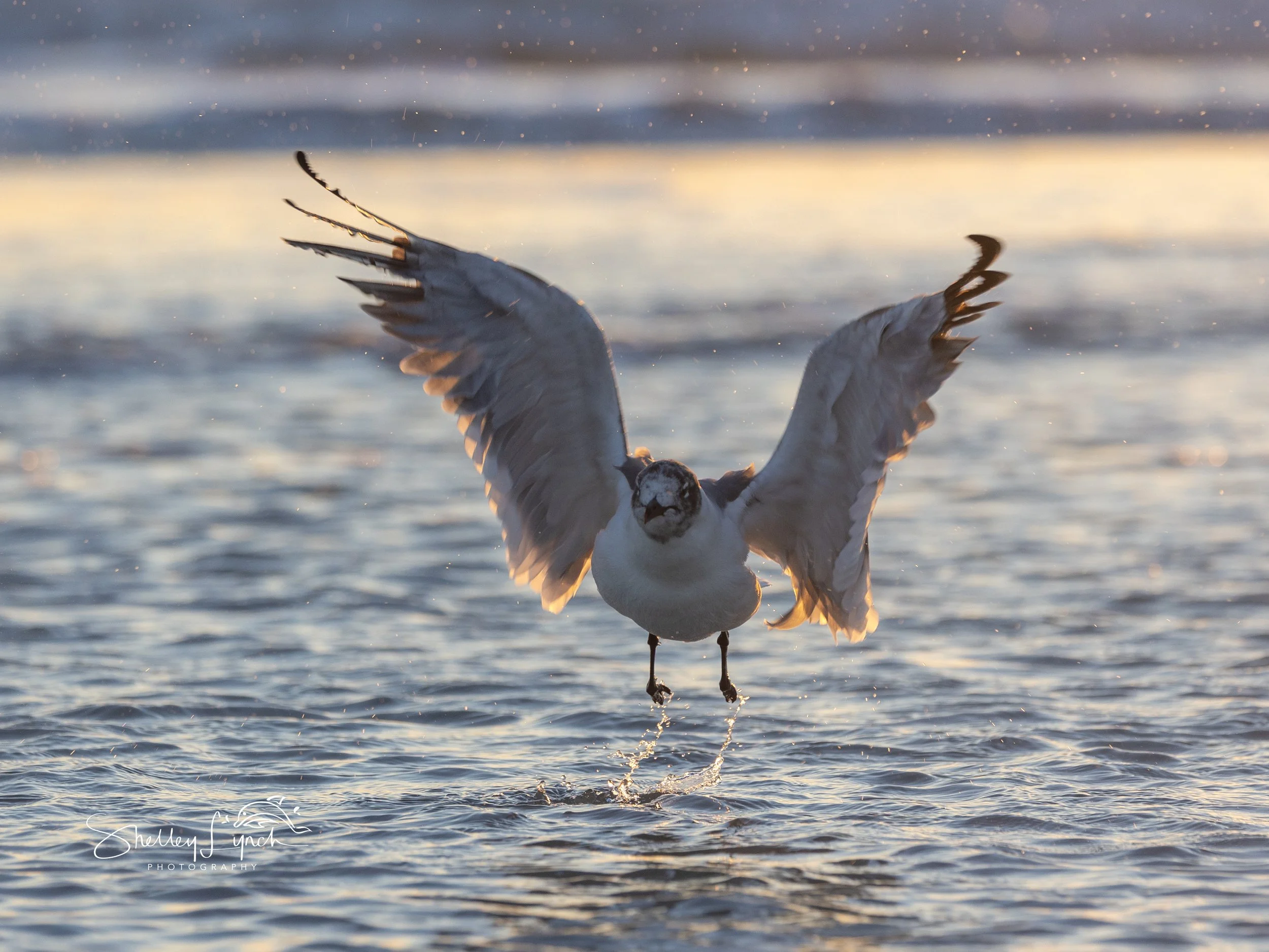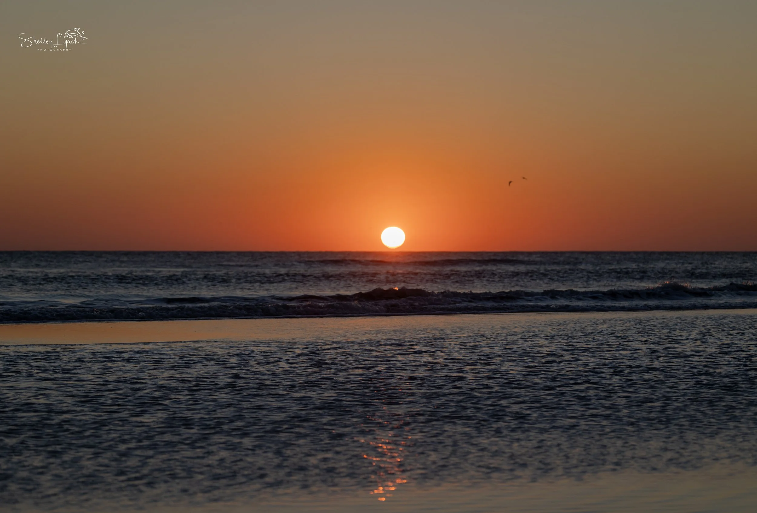 Good morning.The morning was beautiful, with a calm ocean and a glowing sun rising free from clouds. The flock was already at the edge of the shore when I arrived, getting squeaky clean in the shallows.