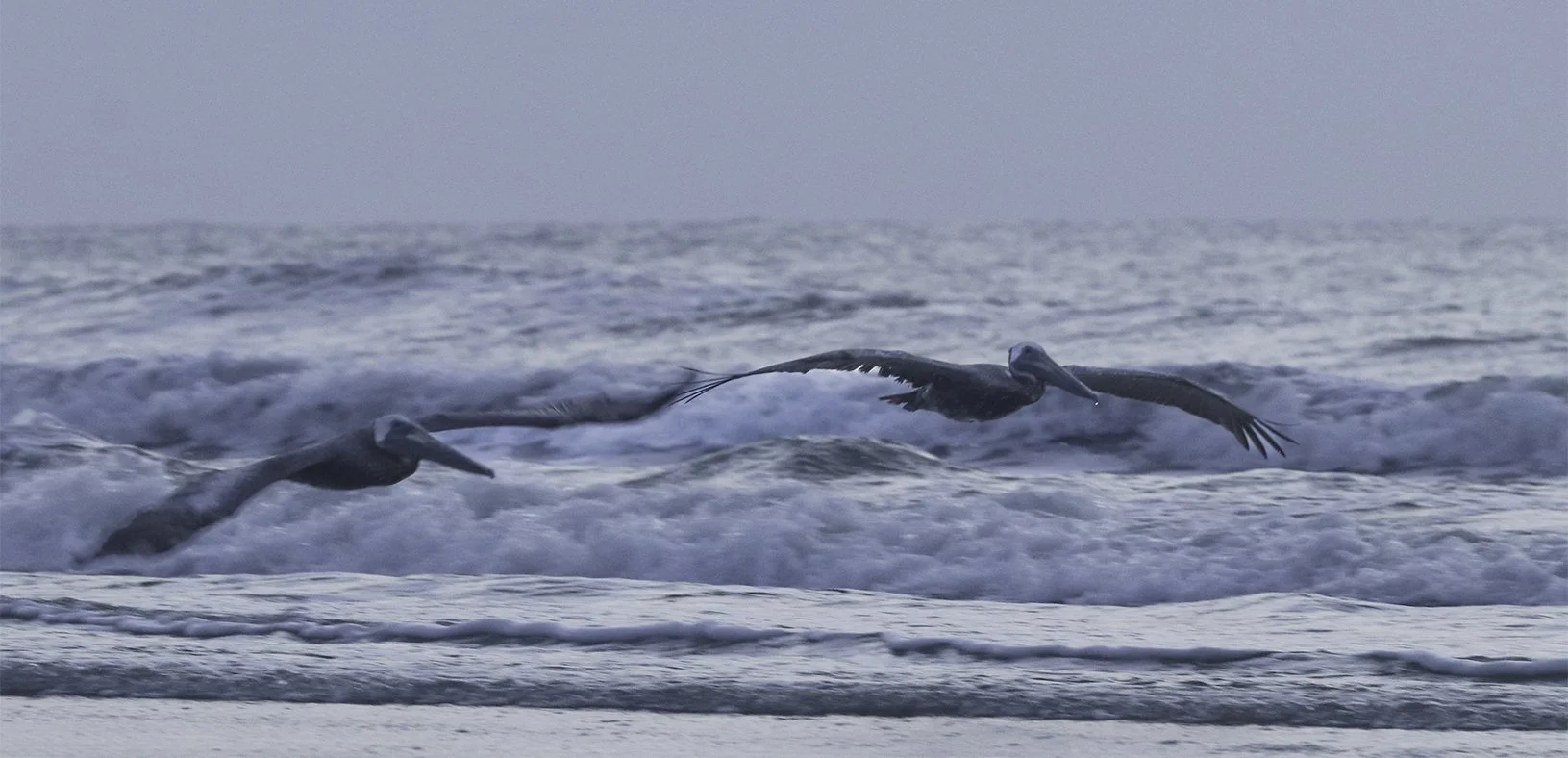 Perfect waves rolled toward shore calling all surfers to come play. Pelican highway got the call too, the traffic was heaving going southbound. 2 pelicans flew by at first light holding wing tips. One of the pelicans looked almost like a ghost. They said, “We bring the message of support both from our earth flock but also our angel flock.”