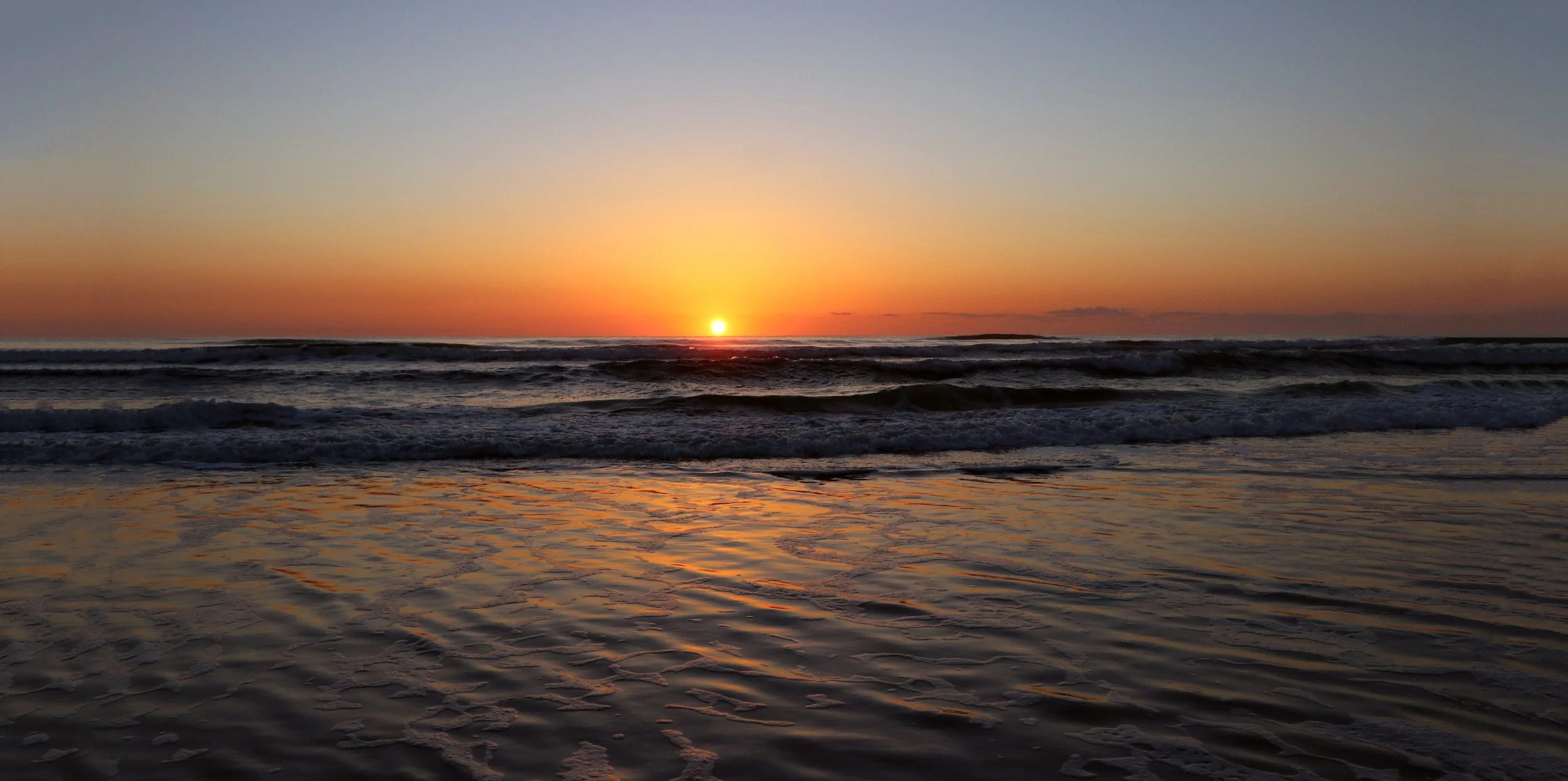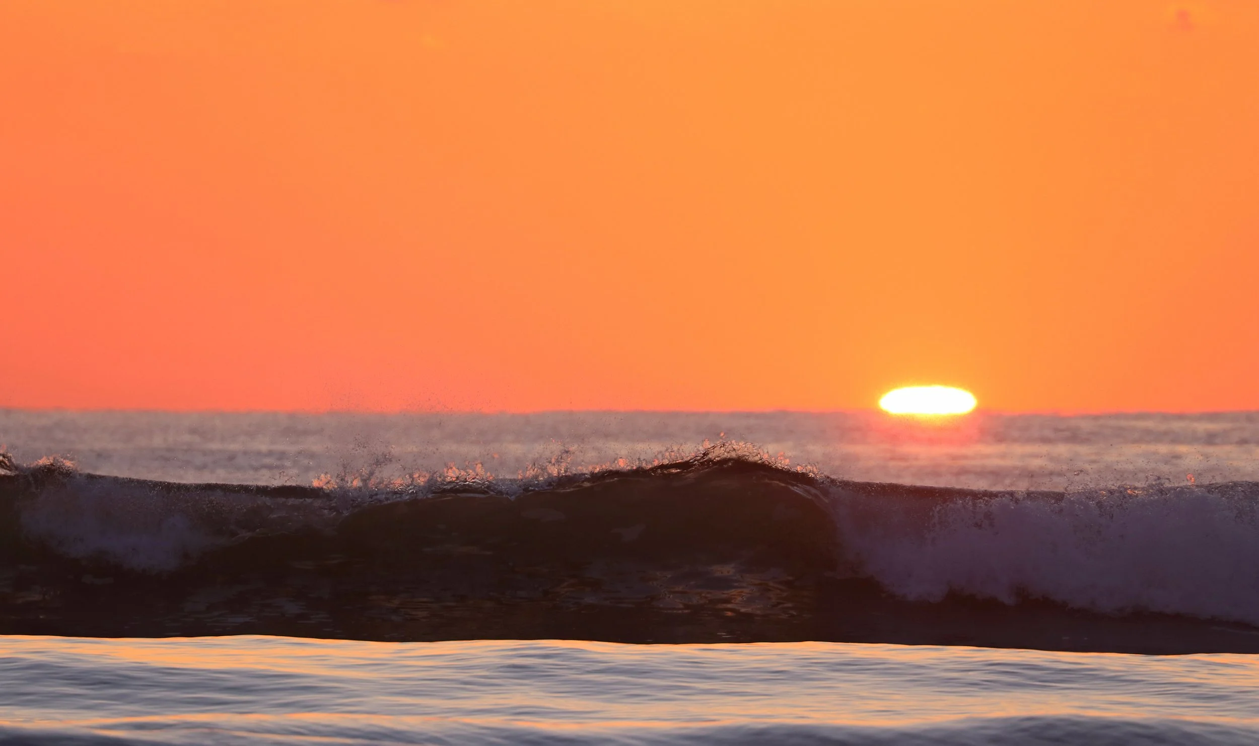 Ahhhhh, a lovely spring sunrise with a pink and orange color show thanks to the huge sun coming up free from clouds. Just a handful of seagulls are hanging around. The waves were perfectly formed beckoning to the surfers to come play.