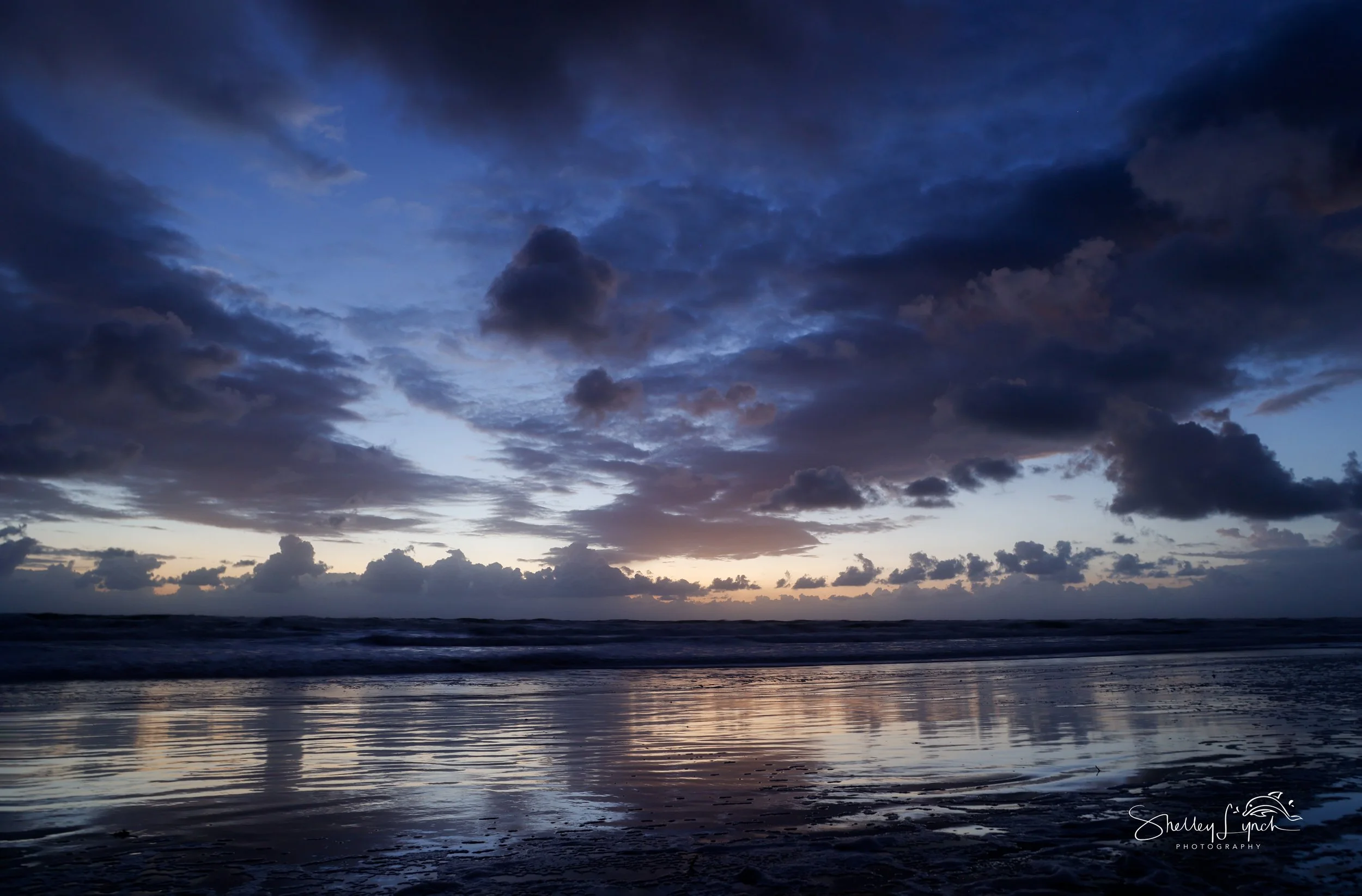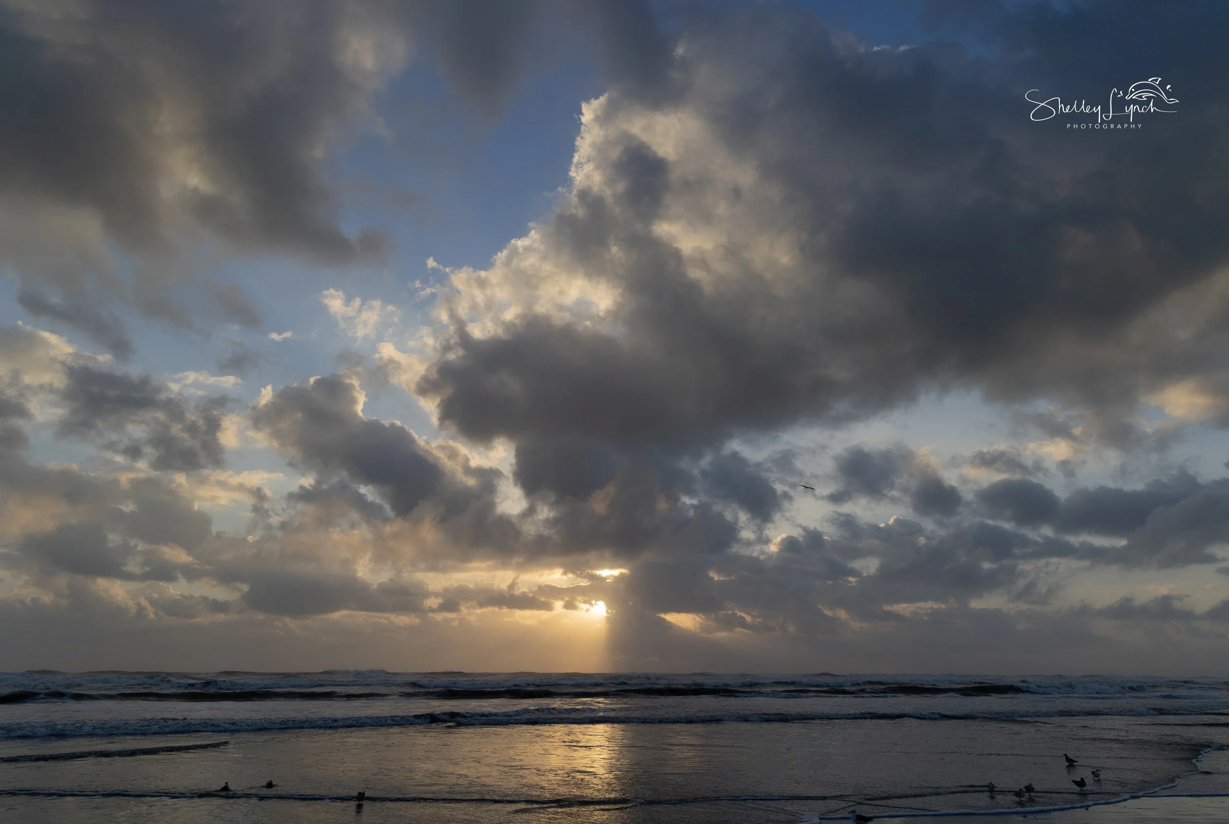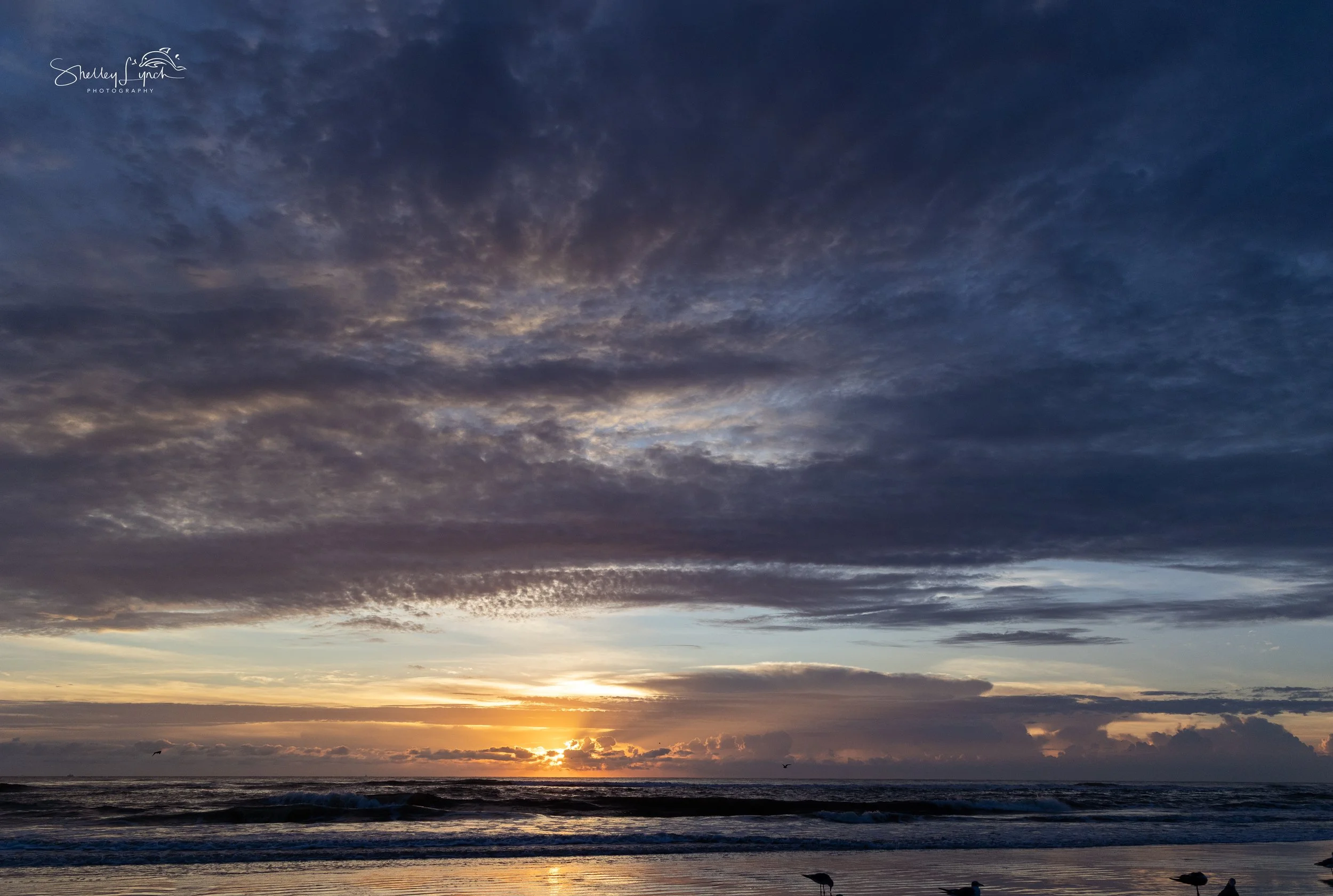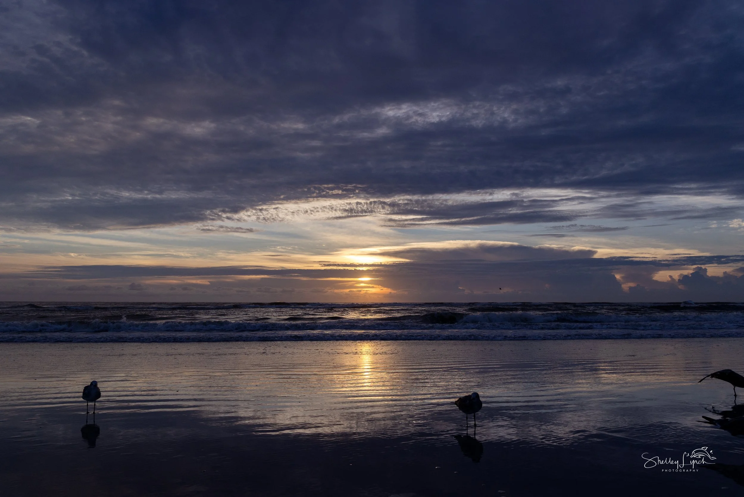 With whipping winds of 15–25 mph, the morning felt invigorating! The ocean churned as the sky came alive with soft pastels, soon giving way to a golden glow as the sun crept upward. The wet sand reflected the shifting colors and clouds, transporting us to a mystical place between earth and sky.