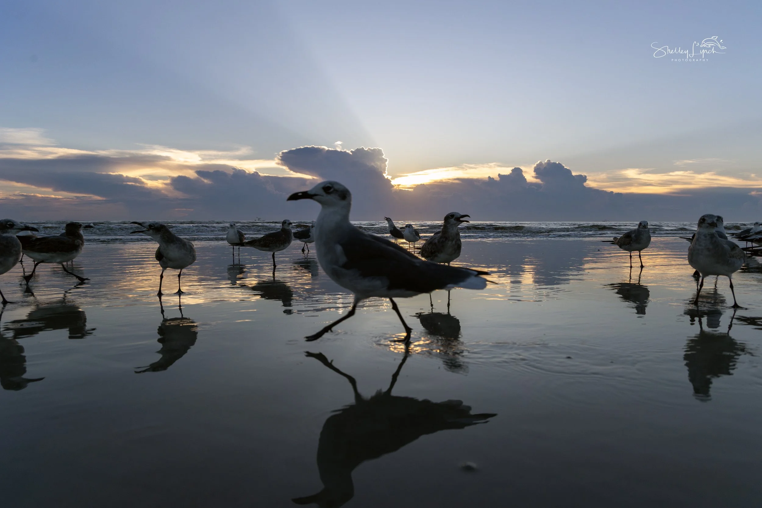 The soft white and pink rays of light jetting into the blue sky were breathtaking this morning. The flock was back in full force, splashing in bath time and frolicking across the glassy wet sand.
